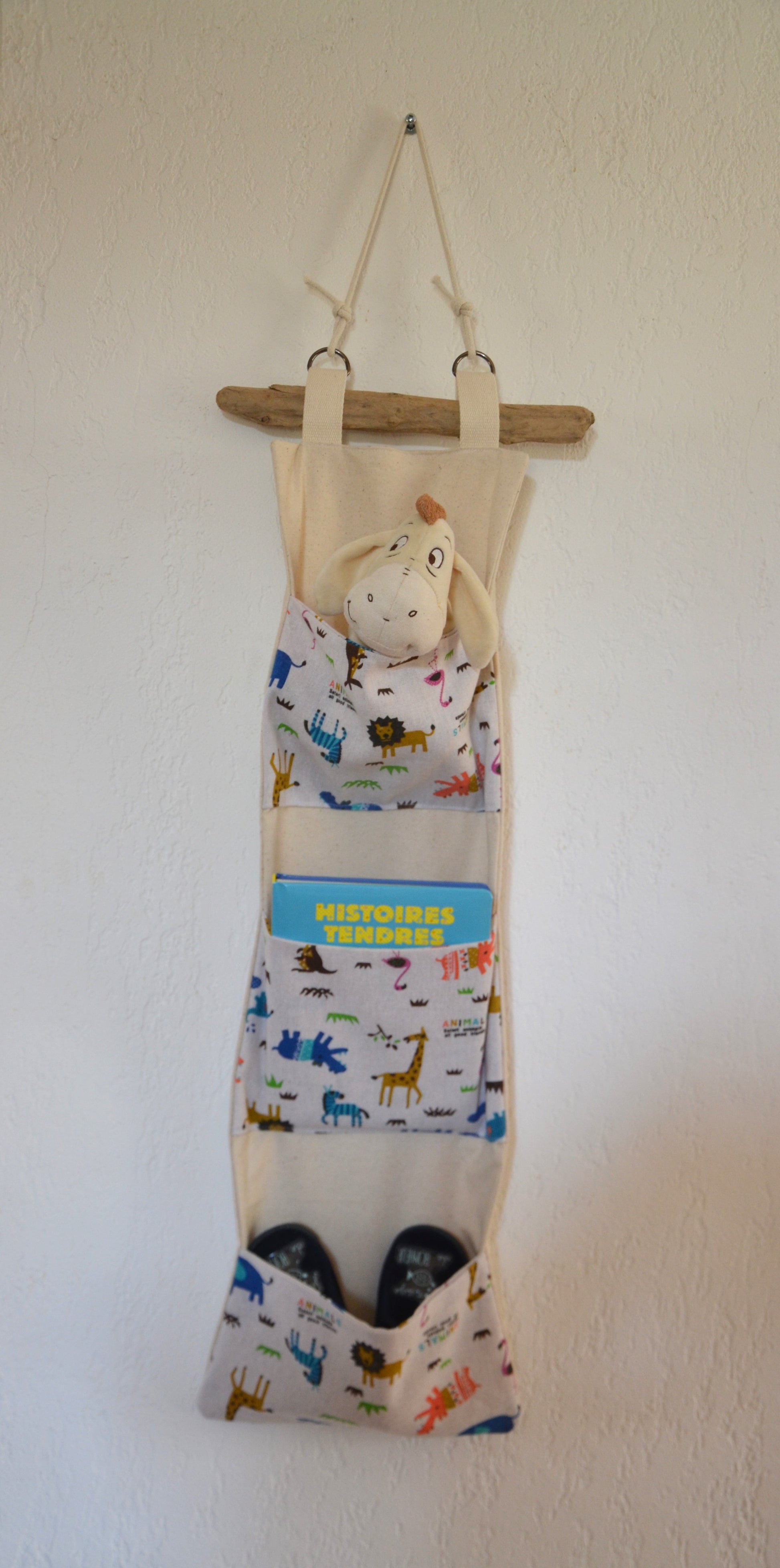 Vous recherchez une solution de rangement pratique et esthétique ? Ce range mural sera le compagnon idéal avec ses trois poches pouvant accueillir peluches, livres ou doudous. La suspension en bois flotté apportera une ambiance zen et cosy.