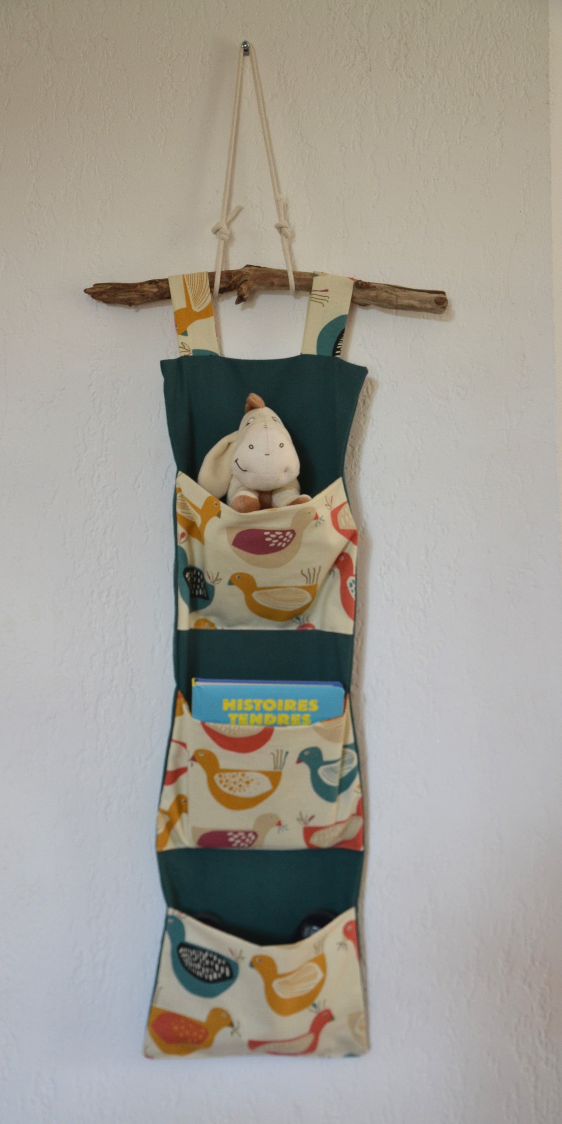 Vous recherchez une solution de rangement pratique et esthétique ? Ce range mural sera le compagnon idéal avec ses trois poches pouvant accueillir peluches, livres ou doudous. La suspension en bois flotté apportera une ambiance zen et cosy.