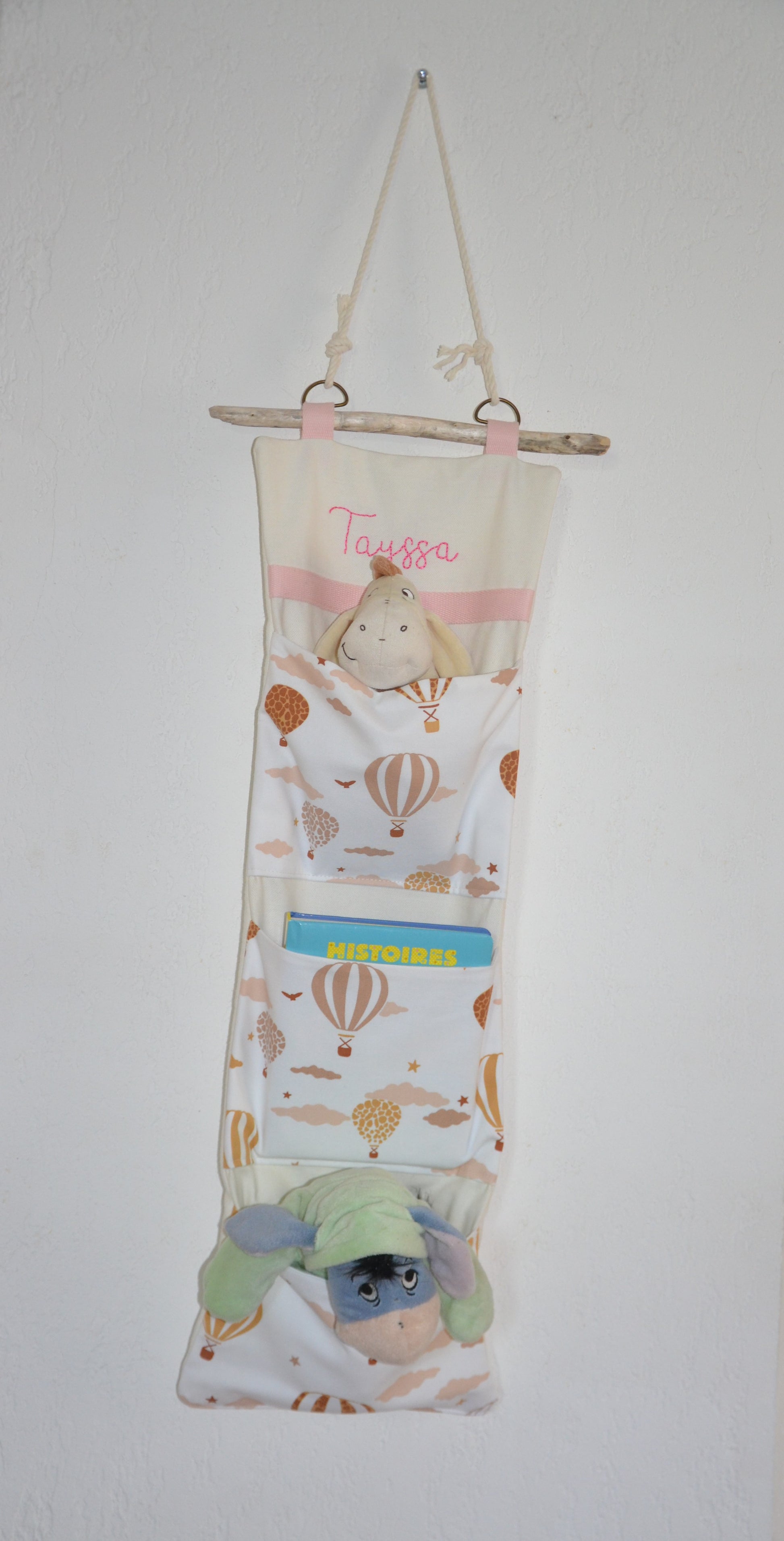 Vous recherchez une solution de rangement pratique et esthétique ? Ce range mural sera le compagnon idéal avec ses trois poches pouvant accueillir peluches, livres ou doudous. La suspension en bois flotté apportera une ambiance zen et cosy.