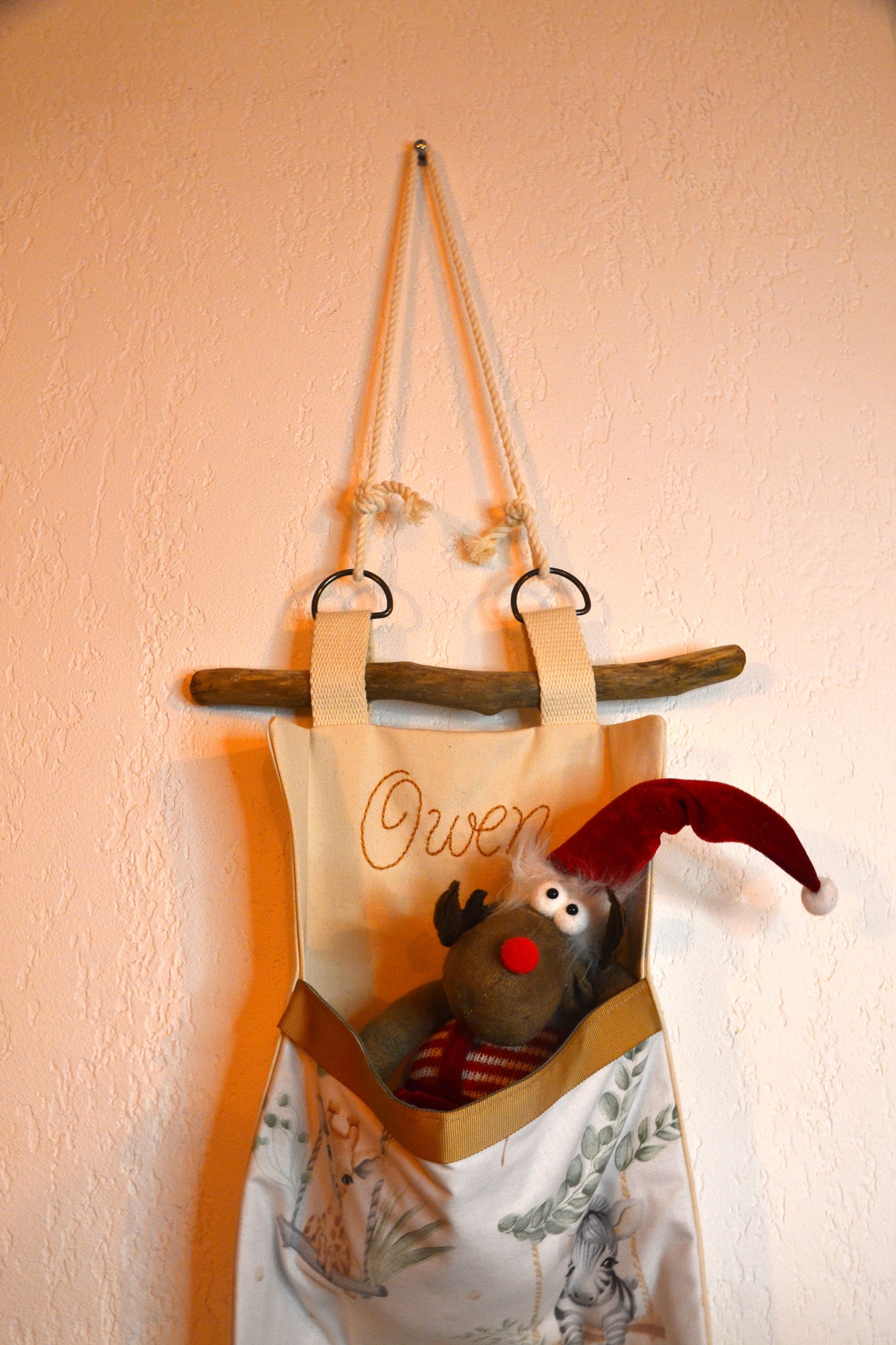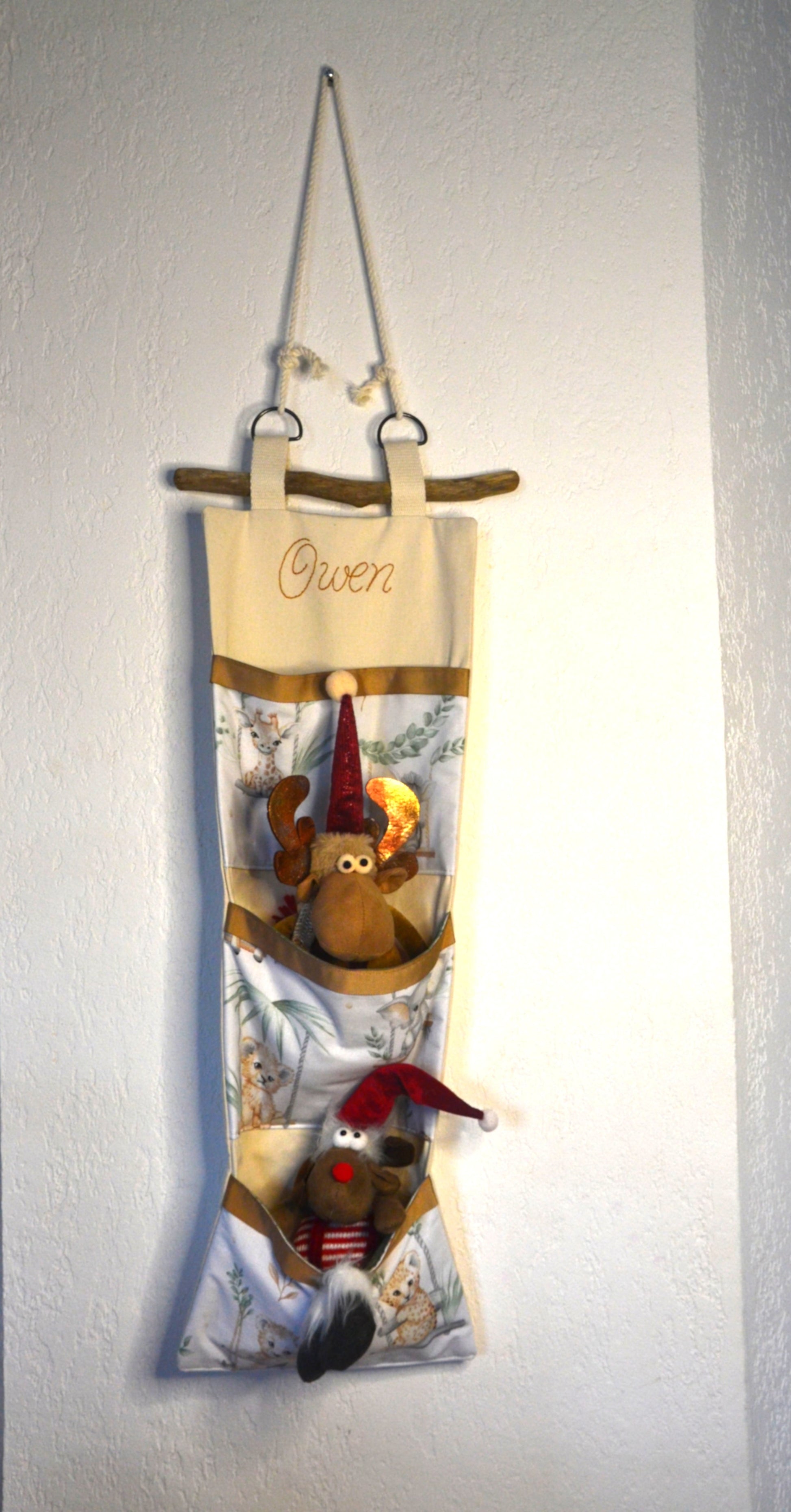 Vous recherchez une solution de rangement pratique et esthétique ? Ce range mural sera le compagnon idéal avec ses trois poches pouvant accueillir peluches, livres ou doudous. La suspension en bois flotté apportera une ambiance zen et cosy.